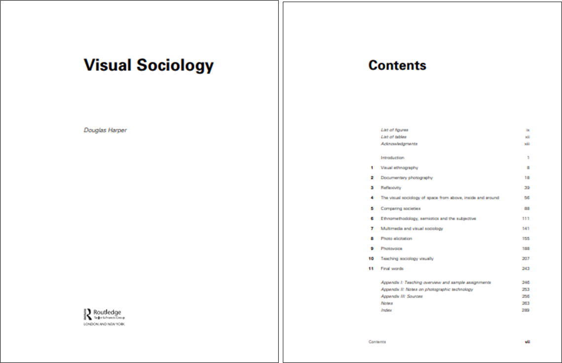 시각 사회학의 선구자인 Douglas Harper에 의해 발간된 "Visual Sociology"는 시각적 사회학에 대한 포괄적인 내용을 다루고 있다. 이 책은 시각적 사회학의 다양한 주제와 관점에 대한 설명과 함께, 작가의 전문적 식견과 다양한 연구적 접근법에 대한 소개가 포함되어 있다.